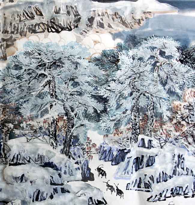 作为在中国东夷文化重要发祥地临沂长大又在孔子故里曲阜师范大学就读的张军来说,自幼接受了内涵丰富和深刻的齐鲁文化滋养。齐鲁文化由齐文化和鲁文化在长期发展中融合而成,两种古老文化差异互补,齐文化求革新,鲁文化重传统,这种地域文化的深刻影响,在张军身上完全体现了出来。他本身就是矛盾的个体,他的绘画鲜明反映出齐、鲁两种文化的各自特点。一方面他接受了正统儒家文化思想和哲学理念的熏陶,内心深处崇尚孟子的尽心、养性、事天、与天地万物融为一体的浩然之气,自幼临习“华龙造像碑”拓,师承于希宁、黑伯龙高徒高在成,反复临习《芥子园画传》,在曲阜师大美术系接受系统中国传统美术教育;另一方面,他的思想比较开阔,思维敏捷,有不墨守陈规的创新意识,加之他骨子里的随性、懒散、自我、无拘无束不拘小节的个性,又使他不满足传统的条条框框,总想跳出传统的窠臼,摆脱依赖,所以严谨的传统理性标准束缚和追逐个性自由的双重心理使他即无法抛开传统又不甘心。这种理性与感性、传统与现代的多重矛盾使他的冰雪画创作呈现出两个走向,一是念念不忘他的故乡沂蒙岱崮的冰雪风光;二是热衷于带有强烈视觉效应、具有笔墨张力的新颖、明快、形式感很强的矾墨画和抽象因素的冰雪画研究。