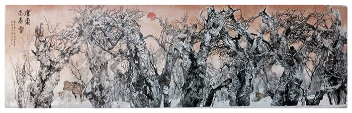 经过反复的探索实践,为了区别于以往的绘画手法。采用全新的绘画语言形成,表现出强烈的视觉冲击力。以“继承不是重复,一切在于创造”的学术主张下,从冰雪绘画技法中脱胎矾墨绘画语境,形成一个全新的绘画样式,来表现这张作品。矾墨的肌理与枣树树皮的质感浑然一体,笔墨力透纸背,反面正面相结合,意象表达,自然流露,光感十足,含蓄浪漫,如释重负!在政府与家乡朋友们的支持下,想法终于变成了现实!